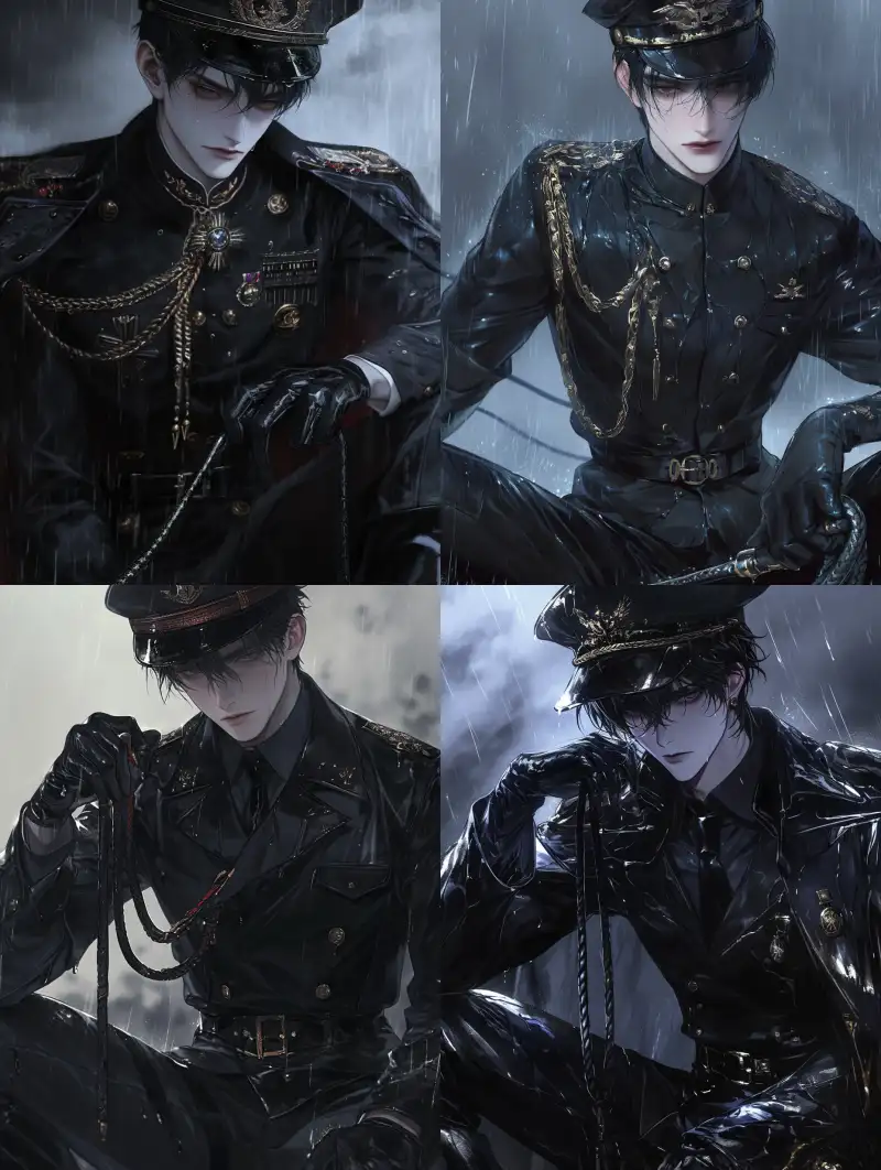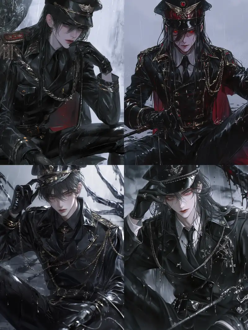 Midjourney Bot 更新时间:2024-06-20 00:04Anime, clear and complex details, high detail, best quality, ultra fine, pixiv illustrations, 8K clear visual effects, deep tones, cool tone, Japanese and Korean comic style, light realism, mature handsome guy, mature man, aristocratic temperament, indifference, black hair, long and smooth hair, black long eyelashes, black military uniform, hat, gloves, huge dragonfly wings on the back, kneeling on one knee, holding whip in hand, war damage, rainy days, wet, real light and shadow, clear and transparent --s 1000 --ar 3:4 --style raw --niji 6
