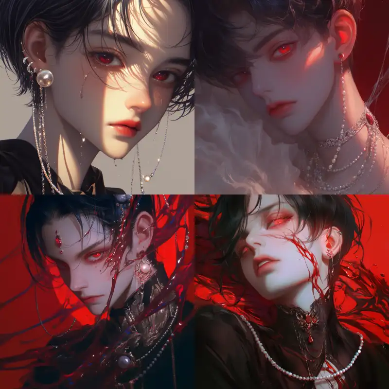 Midjourney Bot 更新时间:2024-06-19 00:03Realistic, male, with red liquid flowing down his cheeks, black short hair, red eyes, pearls, upper body, crazy criticism, sickly, cinematic lighting, bright eyes, exquisite makeup, exquisite accessories, 8k resolution, realism, ultimate details, ultra-high definition, softness, and the highest quality --ar 1:1 --niji 6