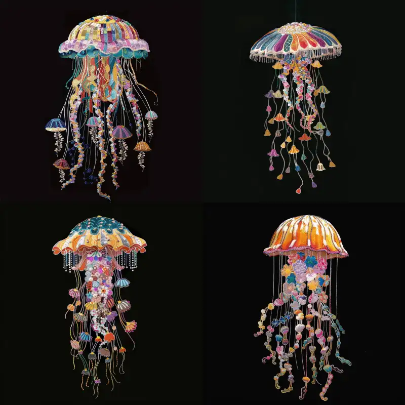 Midjourney Bot 更新时间:2024-06-19 00:03Embroidered pattern design, jellyfish embroidery, exquisite craftsmanship, black background, front view, full body shooting, rich colors --sref