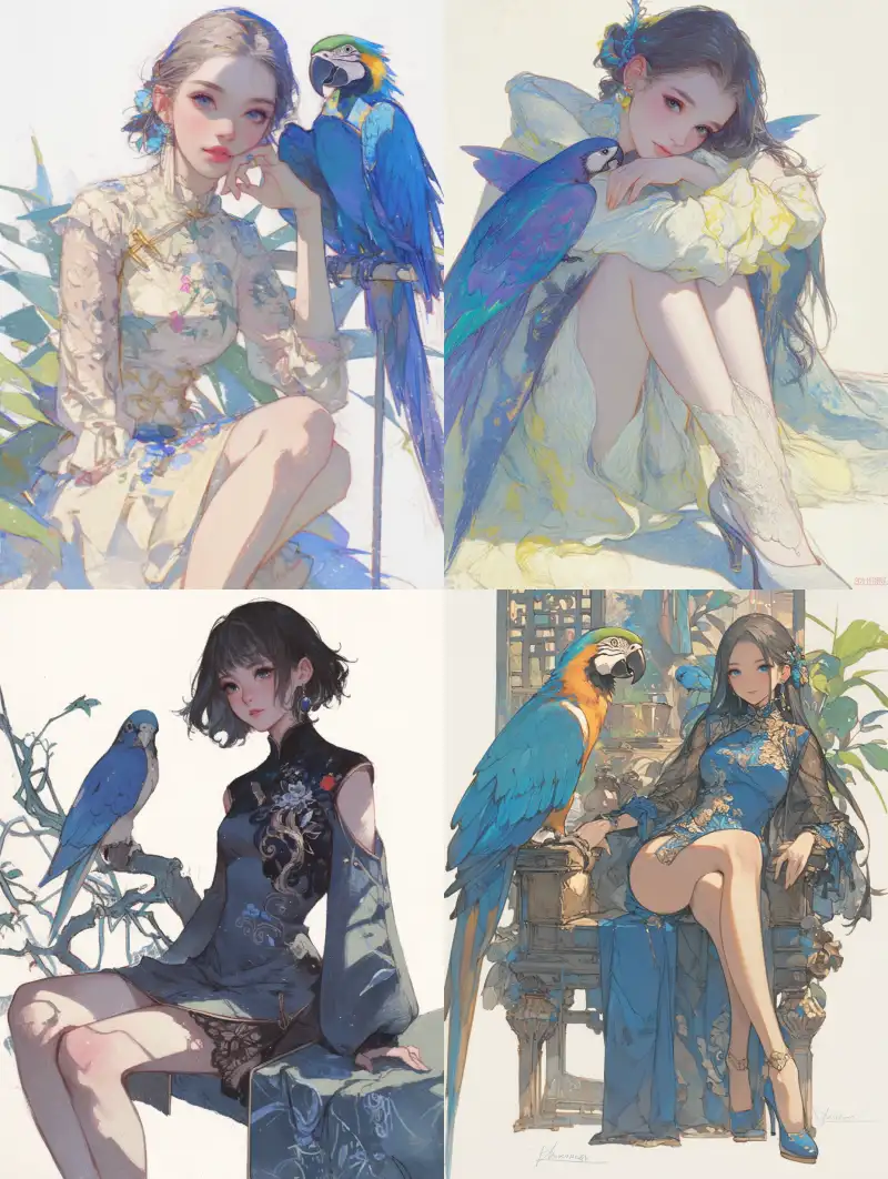 Midjourney Bot 更新时间:2024-06-19 00:05Color pencil drawing, emerald color, Xuancao yellow, beautiful lace skirt, high heels, Chinese girl and blue parrot, looking towards the camera, seven part composition, beautiful lace skirt, anime stills style, exquisite pencil lines, flat colors, advanced color scheme, thick lines, 32k, ultra-high definition, high quality, delicate expressions, natural light, static beauty. --s 748 --ar 3:4 --niji 6