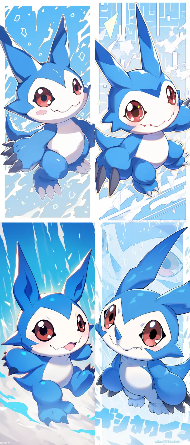 Midjourney Bot 更新时间:2024-06-20 00:00Digimon: Douding Beast, Douding Beast. Douding Beast. Alone, with a full body lens, a cute Digimon type creature, super cute, with creased ears, a round face, cute round hands and feet, big eyes, blue and white color schemes, no nose. Super cute, red eyes, smile, illustrated background, cute style, dynamic movements. Full of cuteness --cref