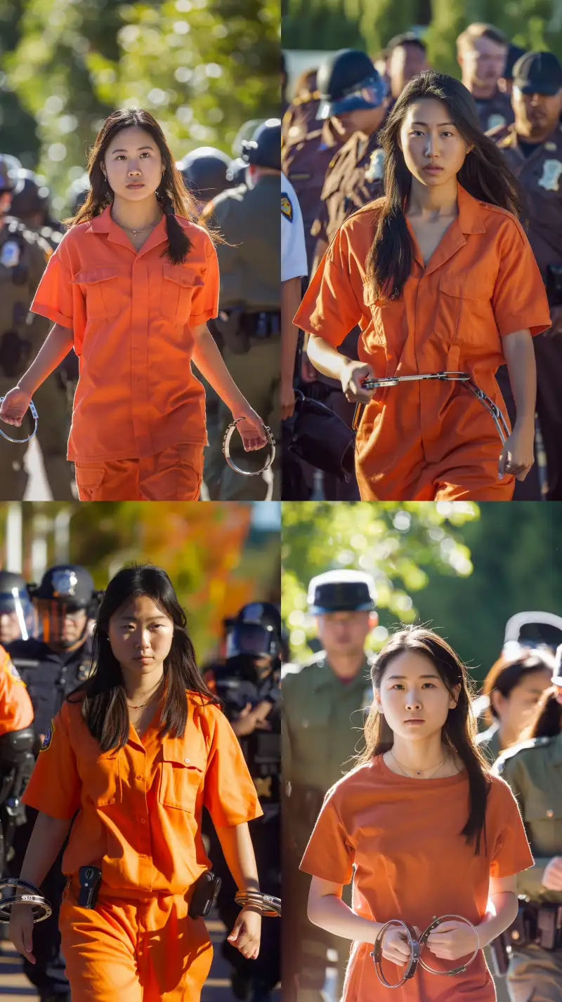 Midjourney Bot 更新时间:2024-06-19 00:00A 20-year-old Asian woman wearing an orange prison uniform with handcuffs on her hands, followed by several police officers, is outdoors with plenty of natural light. --no Black and white, photography equipment, deformed hands --ar 9:16 --v 6.0