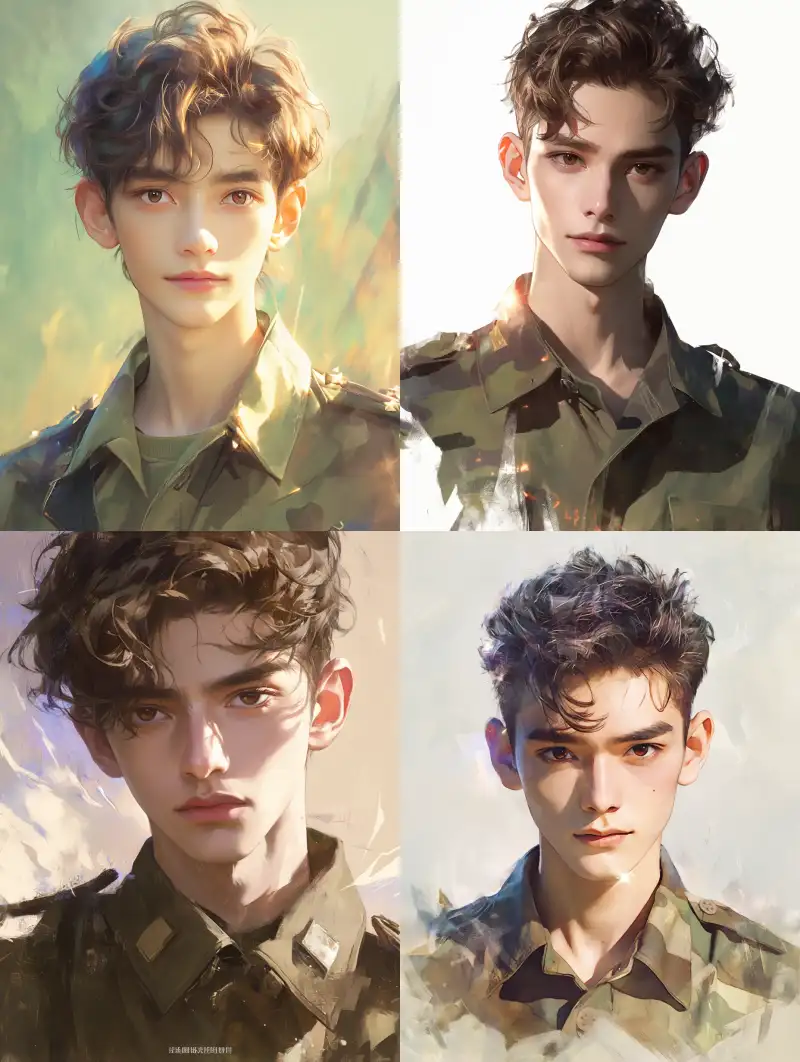 Midjourney Bot 更新时间:2024-06-19 00:01A comic like and super handsome young male soldier, thick coated, sharp and slender eyes, lips slightly downward showing a majestic aura, cold white skin color, brown eyes, smooth and smooth face, fluffy hair, perfect facial features, shirt, thick coated, watercolor, minimalist, CG rendering, ultra-high definition detail rendering, 8K, dynamic, mid to close range, sparkling, high sharpness, strong contrast, incredible facial delicacy and clarity, dazzling light effect background, light tones, spatial sense, natural, fresh, transparent, professional portrait photography grade light effect --no Beard, earrings, wrong hand, earrings, wrinkles, hat --ar 3:4 --niji 6