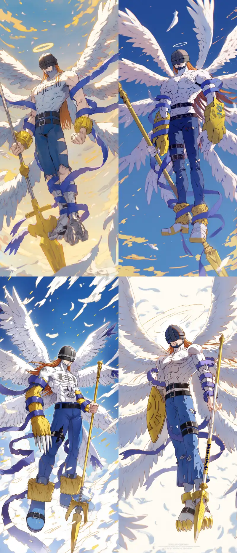 Midjourney Bot 更新时间:2024-06-19 00:02Digimon's angel beast, a fully illustrated angel beast, spreads its wings and flies, holding a spear. He wore a tight fitting suit with blue details, a steel helmet on his head, and appeared handsome. He held a long golden stick, blue ribbons, golden long hair, well-developed muscles, tight fitting clothes, and a tall figure. He has an angelic appearance, a dreamy background, and an artistic style that can influence the style of anime- Cref-CW 100- All clear, blurry, watermarked, close-up, low definition, animation, anime, watermark, misalignment, strange fingers, mutated, fused fingers, incomplete hands, excess fingers- s 500- ar 329:768- niji 6 --cref