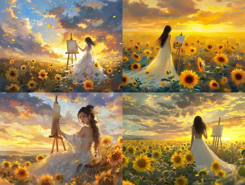 Midjourney Bot 更新时间:2024-06-19 00:02In the high sea of sunflowers under the sunset, a beautiful Chinese woman in a white dress is painting in front of an easel. --ar 4:3 --v 6.0