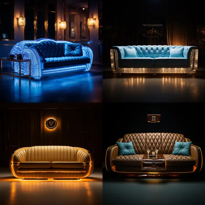 Midjourney Bot 更新时间:2024-06-16 00:00This is a professional photography image of an Italian luxury Bentley sofa taken in 16K ultra high definition, combined with LED lighting, showcasing the luxurious design and exquisite details of the sofa. --s 303 --ar 1:1 --v 5.2