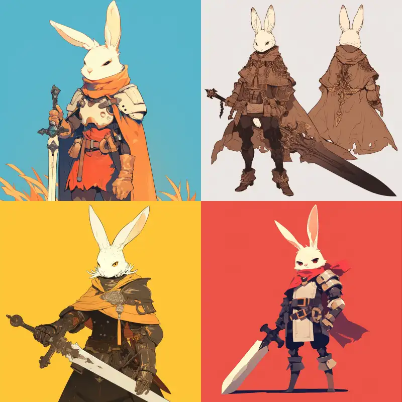 Midjourney Bot 更新时间:2024-06-14 00:03Solid color background, rabbit swordsman, animal character, game character, no brushstrokes, clean color, color blocks, two body proportions, rabbit personification, simple clothing, simple and lively, cloak, brown cloak, shoulder armor, left shoulder cloak --ar 1:1 --niji 6