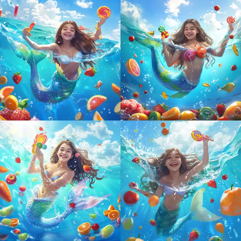 Midjourney Bot 更新时间:2024-06-14 00:03Input prompt words: sunshine, sea, blue sky, a mermaid smiling and half body floating on the water surface. The fish tail is also exposed behind the water surface, with both hands holding lollipops and facing the camera. In the front view, a pile of fruits scattered around the beauty on the water, with colorful and cute colors, and a realistic character style --cref