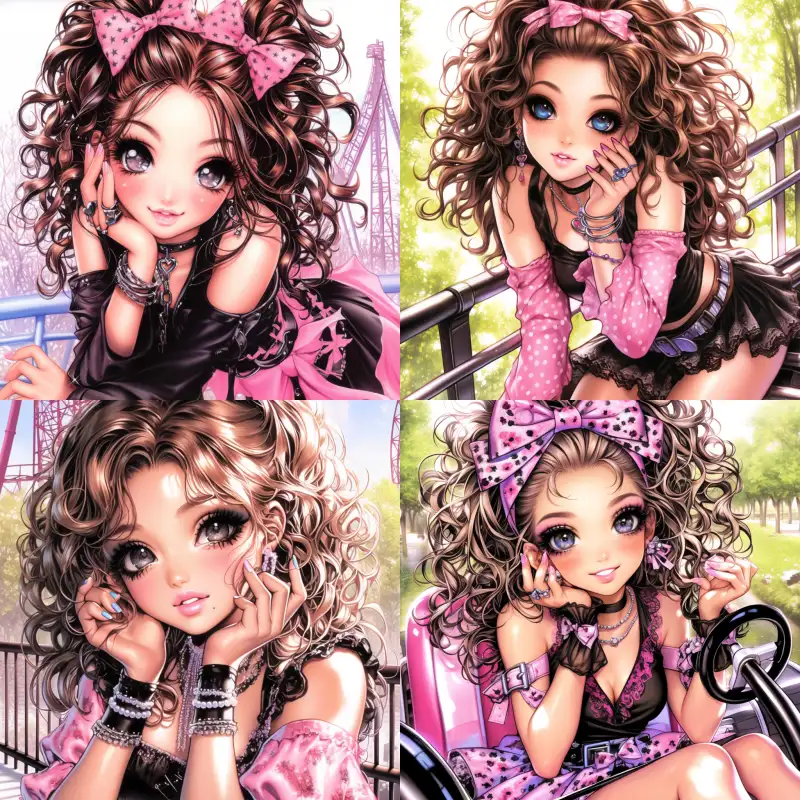 Midjourney Bot 更新时间:2024-06-14 00:04A beautiful and lovely cartoon girl, with oval face, beautiful brown eyes, long eyelashes, light powder blusher, delicate nose, full mouth and shiny light pink lipstick. Sitting on a roller coaster in a dreamy fantasy amusement park with a foreign dress, shiny nails, blue eyes, and tea black curly hair. A cute and beautiful roller coaster ride. Fantasy. Gentle, anime. --sref
