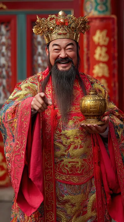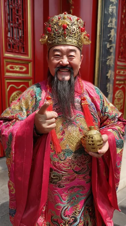 Midjourney Bot 更新时间:2026-02-14 00:34https://images.gogpt.vip/aigf/m_origin/20260213/1950276/g3ukgh776zyvp0q4.jpg https://images.gogpt.vip/aigf/m_origin/20260213/1950276/g0t7zx7ihwxubdw2.jpg https://images.gogpt.vip/aigf/m_origin/20260213/1950276/vq6x6l6s81tmhexy.jpg https://images.gogpt.vip/aigf/m_origin/20260213/1950276/1kq51cxy905nd5b2.jpg https://images.gogpt.vip/aigf/m_origin/20260213/1950276/1vmoktbfap6ga0jg.jpg 中国财神爷,真人实拍,中年标致好看的偏瘦男性福相面容慈祥,笑容自然灿烂有感染力,浓密长黑胡须,身穿精致红金刺绣龙纹官袍,头戴财神冠,一手捧着巨大的金元宝,一手指向镜头(寓意送祝福),整体送福送财的祝福氛围感,背景是红墙金饰的中式宫殿,8K,超高清,电影级打光,商业摄影,细节拉满1 --ar 9:16 --v 7 --stylize 100 --iw 0.25