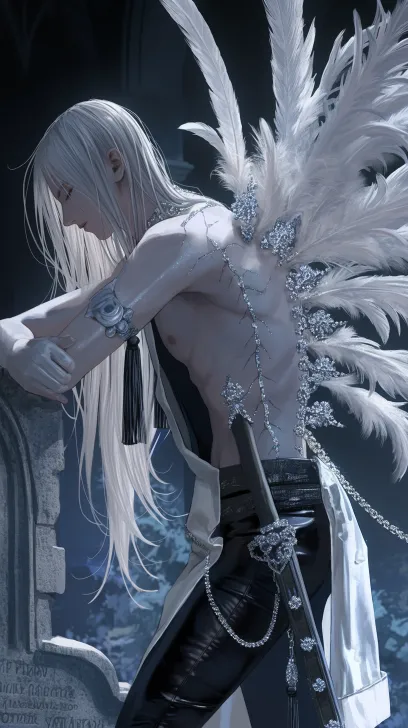 Midjourney Bot 更新时间:2026-02-14 00:37杰作, 顶级品质, 半写实, 电影般的插画,,动漫,清晰,复杂细节,最好的质量,超精细,高细节pixiv插画,画面8K清晰,暗色调,冷色调,天野喜孝风格。一个俊美动漫男人,侧面镜头,蜘蛛亮片背链,脊椎骨带有钻石,tassel钻石水晶串珠背链,白色大羽毛翅膀holding six wings,白色长直发,长发柔 顺,冷白皮,白色乳胶围裙oversized, 拿着剑,,背靠着墓碑上 --ar 9:16 --style raw --stylize 180 --niji 6 --no no