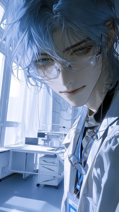 Midjourney Bot 更新时间:2026-02-14 00:38一个打工的男性,皮肤白皙,高鼻梁,丹凤眼,浅蓝色中长发,鲻鱼头,打工人,白色西装衬衫,脖颈上挂着一个蓝色工牌,一副银丝边框眼镜,背景是明亮通透的现代极简风居家办公区,L型白色拼接书桌,浅灰柔纱帘过滤充足自然光,窗外是城市建筑景观,浅色系墙面+深灰地面,自然光形成的光影层次丰富,左边有光,右边是阴暗的,带点黑色没有光,形成两极分化,阴暗明显,人物在中央,背景超级阴暗,呈现暗黑状,手上拿着一把手术刀,低头,bjd,高级cg,8K高清,半厚涂,平涂,极致细节,复杂纹理,纹理笔刷,韩系,色差扩散,三分法构图,泛光效果,背景虚化,俯拍,面部特写,线条流畅,病娇感,藐视感,阴冷感阴湿感 --ar 9:16 --stylize 1000 --niji 7 --no 仰拍,闭眼,