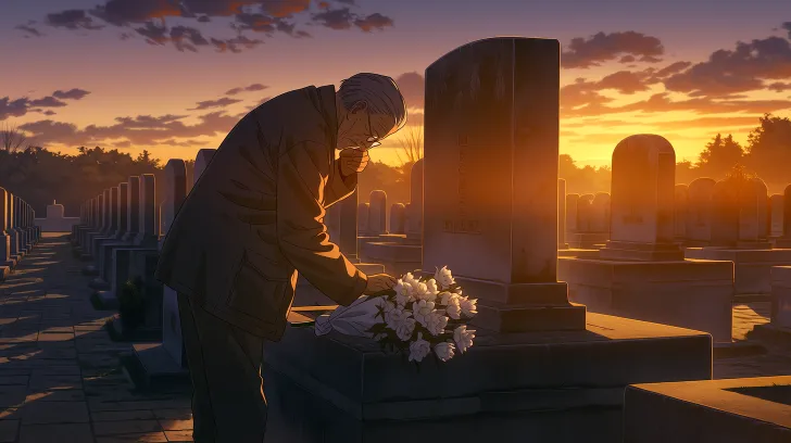 Midjourney Bot 更新时间:2026-02-14 00:39画面主体:一位身着朴素外套的八十岁老人(青木),站在一座简洁的墓碑前。他正用手帕轻柔地擦拭墓碑,碑前放着一束新鲜的白色百合花。 环境与光线:宁静的日本乡村墓园,石板小径,周围是整齐的墓碑。时近黄昏,温暖的夕阳低垂,将天空染成橘红与紫灰的渐变色,为整个场景投下长长的影子与柔和的金色侧光。 关键动作与细节: 近景:老人俯身,专注而温柔地擦拭墓碑,眼神充满追忆与深情。 中景/远景:他转身准备离去,步履缓慢,正用手擦拭眼角。他回头凝望,视线落在身后的墓碑和那束在微风中轻轻摇曳的百合花上。 整体氛围:宁静、孤独、充满追思,光线温暖中带着一丝哀伤,具有电影般的叙事感和时间流逝的意境。 画面参数:写实摄影风格,电影感,黄金时刻光线,细腻的情感表达,景深突出主体,宽幅构图 --ar 16:9 --stylize 100 --niji 7