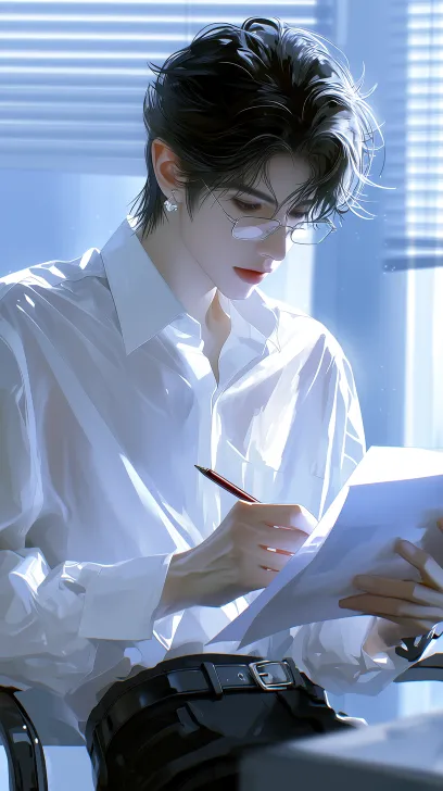 Midjourney Bot 更新时间:2026-02-14 00:411个男生,黑色睫毛 蓬松清晰仿真黑短发背头。冷白皮,精致帅气的五官,水润清透皮肤,细闪清透妆容,眼下细碎亮片点缀。穿着白衬衫 黑色裤子 皮带 嘴角上扬 张扬表情 酷拽。冷酷。冷酷。帅气。拽。眼神光,睫毛清晰根根分明。型男。眼神光。高鼻梁。眼尾上挑。绝美眼睛。大佬风 带着白色眼镜 背景老师办公室 动作:坐在办公椅上低着头拿着红笔在批改卷子 厚涂,伪油画,超精细插画风格,写实质感,柔和自然的室内光线,光影,轻微颗粒感,随性酷感的街头美学。半身立绘 --ar 9:16 --stylize 500 --niji 7