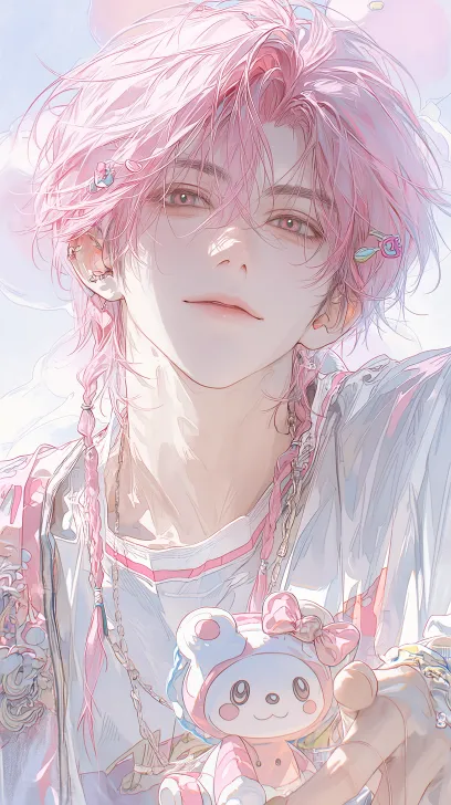 Midjourney Bot 更新时间:2026-02-14 00:42正面观,伪厚涂,真实感,精致男生,眼睛上挑,眼睛大,正面视角,中景,年轻的男人。粉色的眼睛,半身照,看镜头,正面视角,粉色的长发,扎小辫子,头发上有好几个发卡,穿着白色的亚文化露肩上衣,粉色线条,衣服上有卡通装饰,眼神柔和,一只手拿着一个小的卡通动物玩偶,背景是娃娃机,糖果色的环境,光线柔和但是人物脸部清晰 --ar 9:16 --stylize 1000 --niji 7