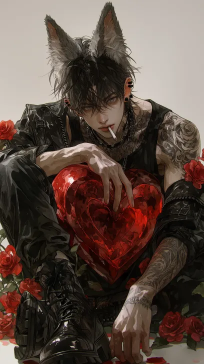 Midjourney Bot 更新时间:2026-02-14 00:46男人,黑色三七分大背头短发,头上有着灰色狼的毛绒耳朵,狼耳朵上有着黑色耳钉,五官深邃富有攻击性,淡蓝色瞳孔,竖瞳,粗汉感,黑色耳钉,肌肉结实饱满,胸肌结实 黑色背心,加上黑色皮质衣服,耷拉在身上,肩膀处有着大面积花纹纹身,黑色长筒皮质靴子,黑色裤子粗汉感,痞气感,帅气感,疯批感 身后为几朵红色玫瑰花,坐在地上动作懒散,双腿随意摆放,左单手搭在一颗巨大的红色爱心雕塑上,动作懒散自然,嘴里叼着烟 脸部被打上白色氛围感灯光,脸部有着bjd质感,超高清画质,脸部有着放大特写,细节描写,冷色调,皮肤白皙 --ar 9:16 --stylize 823 --niji 7