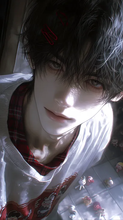 Midjourney Bot 更新时间:2026-02-14 00:47正面观,伪厚涂,真实感,精致男生,眼睛上挑,眼睛大,正面视角,中景,年轻的男人。黑色的眼睛,半身照,看镜头,俯瞰视角,黑色的短发,头发上有好几个红色细发卡,穿着白色的亚文化上衣,内搭红色的格子衫,衣服上有同色系卡通装饰,眼神柔和,背景是室内地板,散落了一地的娃娃,光线昏暗柔和但是人物脸部清晰 --ar 9:16 --stylize 1000 --niji 7