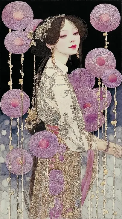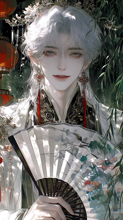 Midjourney Bot 更新时间:2026-02-14 00:48画质|超高清画质 画质清晰 线条唯美 64k画质 细腻伪厚涂 笔触感 笔触细腻 低饱和度 CG bjd质感 8k高清 cg渲染 极致渲染 光影渲染 冷色调 颗粒感 氛围|冷色调 淡色调 暗色调 暗红色调 人物中心打红光 诡异氛围 恐怖氛围 忧郁病娇 阴湿男鬼【血色调】 面部|美男子 冷白皮 奶油质地 皮肤洁白如雪【皮肤惨白】 眼尾狭长 眼尾上挑 睫毛纤长 眼神点光 眼神暧昧 眉毛下挑 淡色嘴唇 纯色晕染 头发|白色长发 长发随意的披散在肩头 长发及腰 发丝凌乱蓬松 发丝柔顺且富有层次感 发丝中心打光 每根发丝发光 发丝根根分明 发丝毛绒质感【根根分明】 发饰|唐朝状元帽,帽插宫花 服饰|穿着一席唐朝状元服,手拿水墨画折扇 视角|正面视角 道具 | 右手拿折扇扇风动作 背景 | 绿色垂柳,古道小镇路上,路上行人幻影,红色灯笼 从上往下拍,俯拍 --ar 9:16 --stylize 885 --niji 7