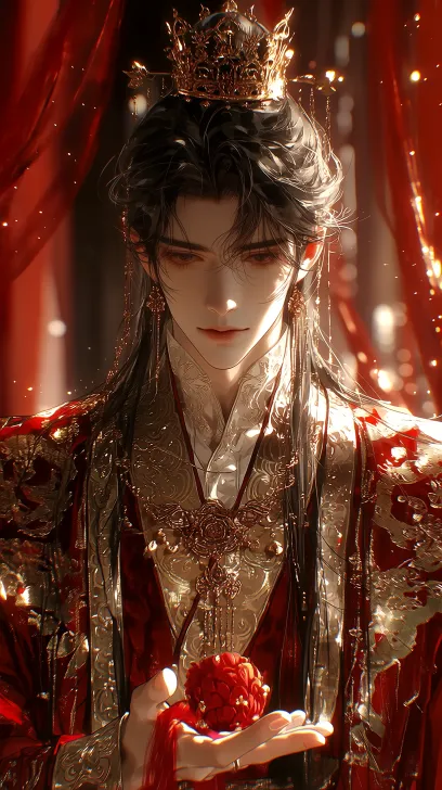 Midjourney Bot 更新时间:2026-02-14 00:49超写实风格+高级cg+高清渲染,8k,真实感,精致男生,眼睛弯弯,正面视角,中景,成熟的男人。黑色的眼睛,半身照,看镜头,正面视角,黑色的长发(古人发型),头戴古代金色发冠,高马尾,红金色的的精致古代衣袍(嫁衣)(金色绶带)(金色纹路),手里拿着红布做的大绣球,衣袖飘飘,在一个富丽堂皇的屋子,红色的纱幔,明亮的阳光,光线柔和,面部清晰,神色温柔。 --ar 9:16 --stylize 1000 --niji 7