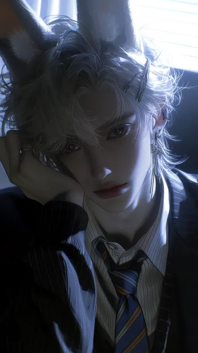 Midjourney Bot 更新时间:2026-02-14 00:50厚涂BJD风格,全景构图,皱眉,男性,人物全身,明亮白光,室内顶光,8k,明亮光,柔和漫射光,冷调光影,人物面部光影层次,发丝光影细节,单人物主体构图,氛围感光影,明暗对比,金发狼尾发型,兽耳装饰,手托脸颊姿势,黑色牛仔外套,条纹内搭,蓝棕拼色领带,耳饰配饰,精致眼妆,冷感妆容,面部精致五官刻画,BJD人偶质感肌理,全景构图,成男 --ar 9:16 --stylize 843 --niji 7