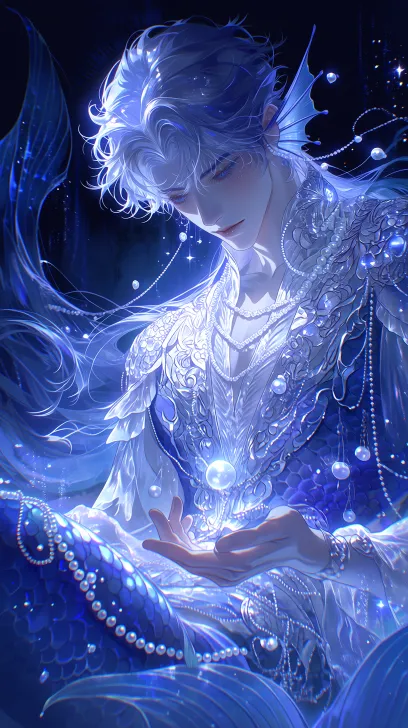 Midjourney Bot 更新时间:2026-02-14 00:53东方美少年,种族:美人鱼:皮肤自皙,微熏。眼睛狭长(漂亮的瞳仁,微眯,浓密清晰的睫毛,芭比感的睫毛)白皮肤,细腻的白皮肤。眼波含媚、唇水润抿着,微醺病娇感、眉眼妖冶。渐变紫色长发(无刘海后梳,前短后长,微卷发尾,光泽感,根根分明,贝壳珍珠装饰少年的躯干上缠绕珠光纱贝壳,面部人鱼的全身图,竖立游动状态,巨大华丽的梦幻的冰蓝色人鱼尾巴展现出阴暗病态的气质同时脸上带着羞涩神情。画面逆光效果,镜头模糊且极具颗粒、磨砂质感。手心向上摊开,一只手朝镜头方向伸出, 从动态视角的仰视角度拍摄,背景是深海深渊之下神秘的墨蓝色梦核场,手上有个悬浮珍珠,莹润的珍珠还在发亮皮肤莹润珠光感皮肤,通透肤感,中式华丽繁复美学风格2.5D伪厚涂,半写实风格,材质纹理渲染+胶片颗粒细节 --ar 9:16 --c 14 --stylize 1000 --niji 7 --no Profile,侧脸,脸部特写,3D画风,现实画风,扭曲脸部,奇怪比例,非p值画风,人物畏手畏脚,人物模糊,害羞,可爱,萌妹子,萌,幼态脸,眼睛发光,仰头,大红厚嘴唇,水滴,丝带,绷带