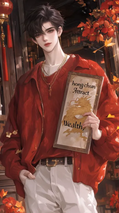 Midjourney Bot 更新时间:2026-02-14 00:54一位清俊温柔的东亚少年,身处充满年味的古风市井街道,前景是巨大的红色烫金装饰,带有金色龙纹与梅花图案,金粉质感闪耀;少年手持写有金色“招财”书法字体的红底挥春,另一只手拿着红色装饰的冰糖葫芦。他留着干净利落的黑色微卷短发,身穿红色软糯毛衣搭配白色内搭与白色下装,面带温柔清爽的微笑看向镜头;背景是错落的古风木质建筑、悬挂的黄色灯笼,街道上有模糊的人群,营造热闹的春节市集氛围;自然光与街头暖光交织,浅景深效果突出主体,画面色彩浓郁喜庆,胶片复古质感,高清细节,原比例构图,写实人像摄影,动态抓拍感,马年新春氛围拉满。 丰满妆容,细腻肤质,最佳质量,16K质量,超高清,超精细,高分辨率,半写实动漫风格,全身角色,头部特写,全身,全景,半身, --ar 9:16 --stylize 283 --niji 6 --profile qj3ncyd i4tdin8
