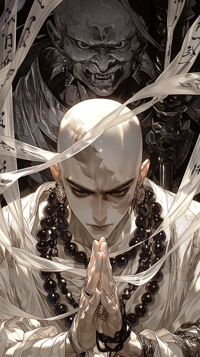 Midjourney Bot 更新时间:2026-02-14 00:54这是一幅采用国风禅意风格绘制的画面,画面主体是一位光头人物,双手合十,眼睛狭长,头上有戒疤,他身着一件白色且带有细腻纹理的禅服,脖颈间佩戴着多层深色的佛珠,精致的耳饰点缀其上。人物的周围环绕着半透明的纱幔,纱幔上有着黑色的书法文字。背景中居中位置有一个佛,神像凶恶,拿着降魔杵,黑暗风格。 --ar 9:16 --c 7 --weird 352 --stylize 1000 --niji 7 --no 闭眼,精灵耳,
