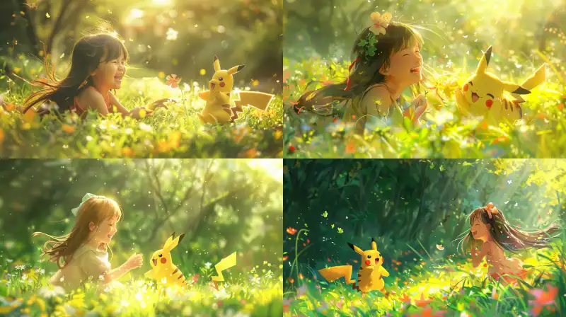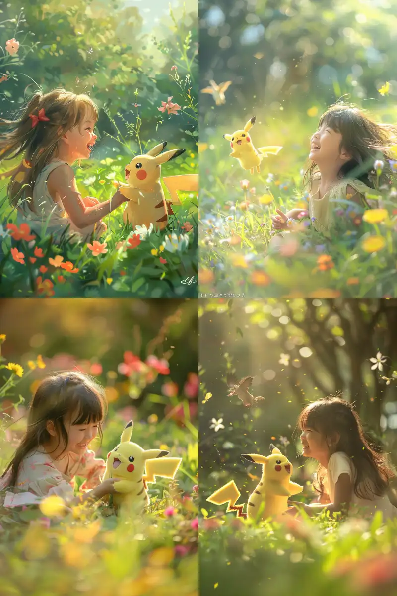 Midjourney Bot 更新时间:2024-06-13 00:04A sweet little girl was laughing uncontrollably, playing happily with a cute Pikachu on the green grass. The sunlight fell on them, and the little girl's long hair fluttered with the breeze. Pikachu skillfully jumped and his tail was raised high. Surrounded by colorful flowers and cheerful small animals, it seems as if telling this innocent and innocent friendship story.,Fujicolor C200::50 --ar 9:16 --v 6.0