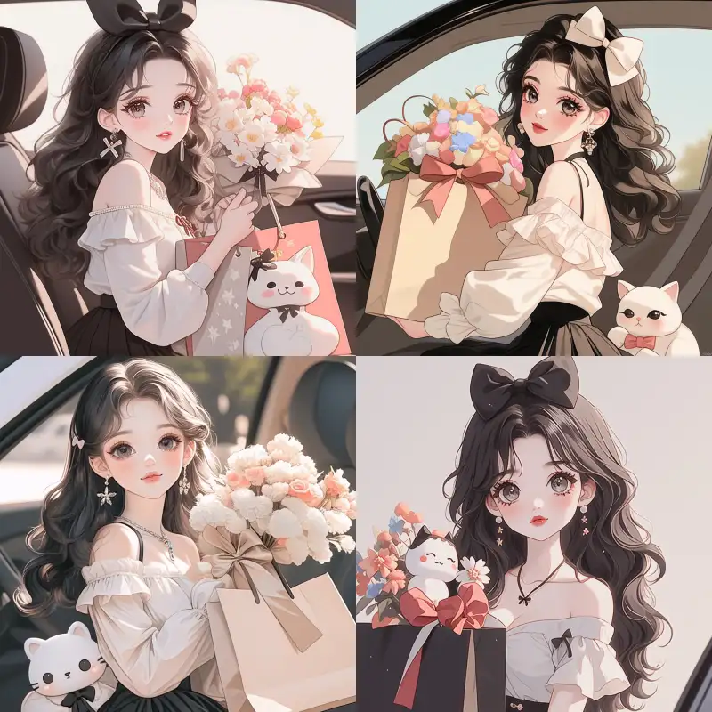 Midjourney Bot 更新时间:2024-06-13 00:04Created by Heif Kalaman and Yumiko Takahashi, 18 year old cartoon character in Q version, Disney style, a lovely girl, with long slender curly eyelashes, powder blusher, eye shadow, shiny lipstick, long hair curly, bow hairpin. White off shoulder chiffon shirt, black pleated skirt, sitting in a car, holding a shopping bag with a colorful bouquet of starry flowers. There is also a cute white cat sitting on the shopping bag, with a side view or camera view of the upper body, minimalist lines, artistic lines, soft and delicate images, flat illustrations, perfect street graffiti art, realistic hair. I can't imagine how beautiful, high-definition, and high-quality animated screenshots there are --sref