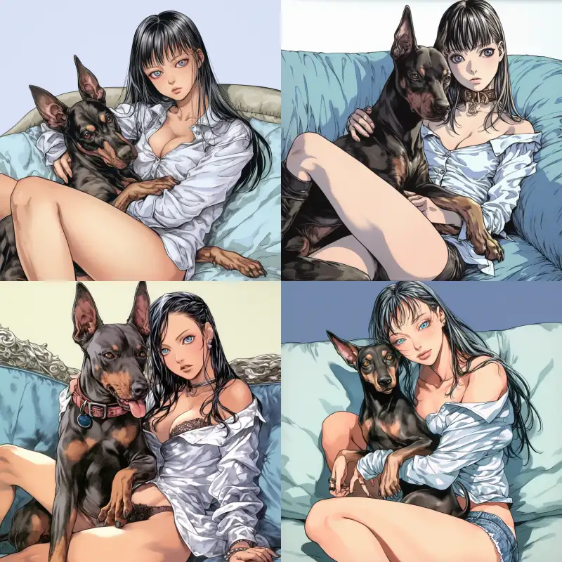Midjourney Bot 更新时间:2024-06-14 00:00Self portrait action: A girl wearing a white shirt is sitting on a light blue sofa with a Doberman in her arms --sref