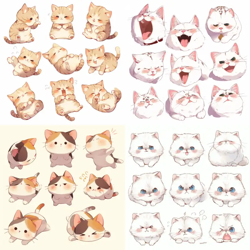 Midjourney Bot 更新时间:2024-06-14 00:00A little cat with a white background drawn with wavy lines, designing emoticons, emoticons, different expressions and postures, different expressions and postures, happiness, surprise, fear, nervousness, drowsiness, confidence- ar 1:1 niji 5 --ar 1:1 --niji 6