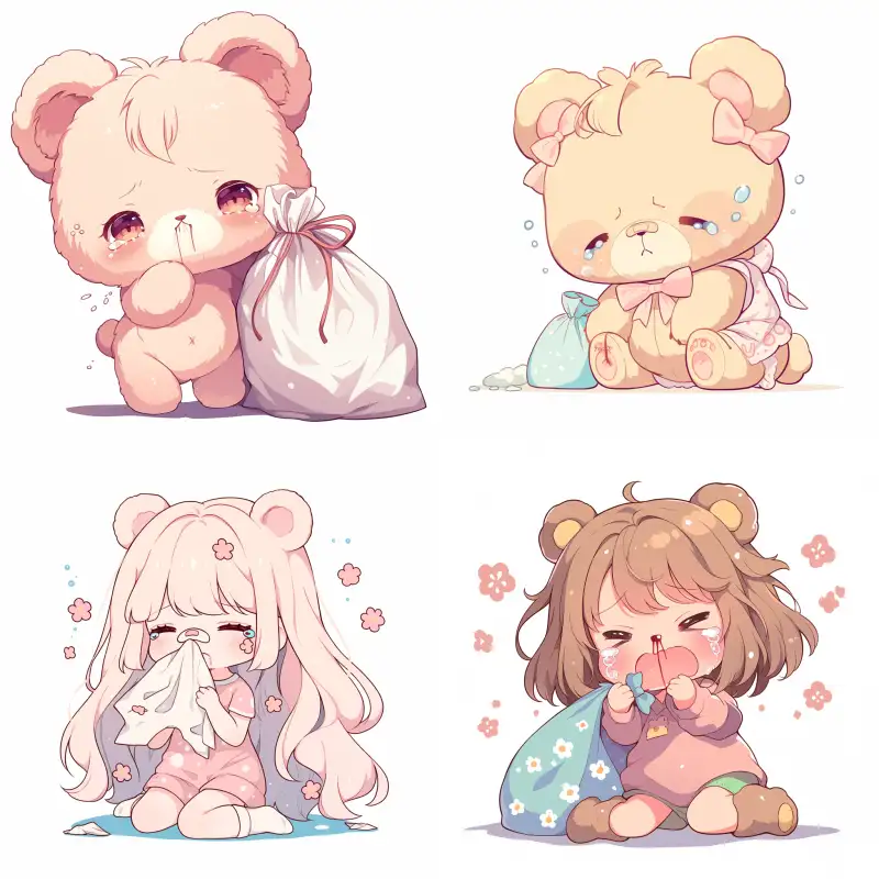 Midjourney Bot 更新时间:2024-06-14 00:00A cute Chibi bear girl with a garbage bag on her back, nosebleeds, crying, and a Chibi style, Chibi, Kawaii style vector painting on a white background, style, lace fur. Clip art, white background, kawaii comics, chubby anime dolls --ar 1:1 --niji 6