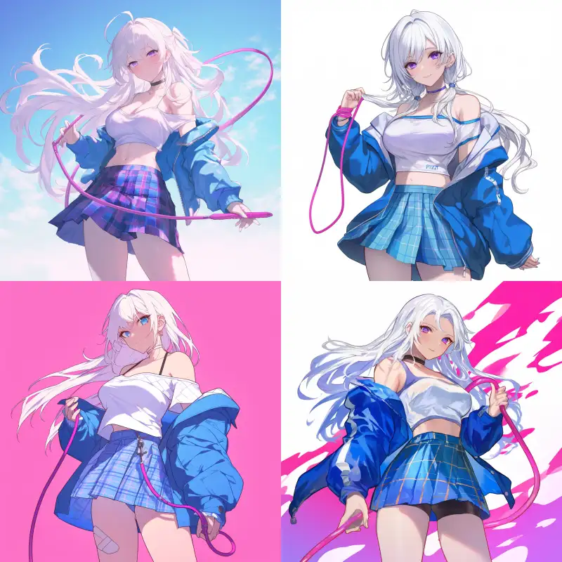 Midjourney Bot 更新时间:2024-06-11 00:07White hair, long hair, female, blue sportswear jacket, white thin shoulder straps, off shoulder, blue checkered skirt, holding a pink whip in one hand --ar 1:1 --niji 6