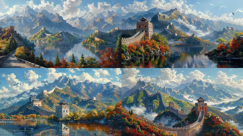 Midjourney Bot 更新时间:2024-06-11 00:07The Great Wall, high mountains, clouds, and mist are full of vitality, creating a dreamy landscape style with photo like details. The romantic river landscape in golden autumn is of ultra-high definition and high-quality. Photography grade works include oil paintings with golden autumn tones, --sref