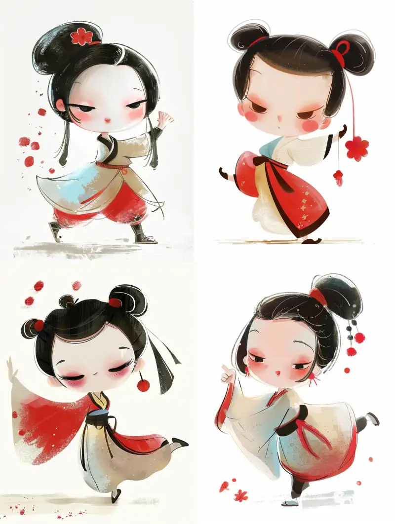 Midjourney Bot 更新时间:2024-06-08 00:00A super cute little girl from the Tang Dynasty in China, with a funny expression and a proud and delicate demeanor. She kicks her legs high in front of her to practice Chinese martial arts. She has a white background, a distant view, illustrations, and a minimalist design style. --cref