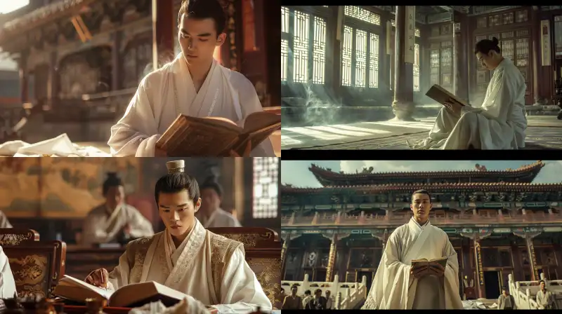 Midjourney Bot 更新时间:2024-06-08 00:02In ancient China, in the imperial palace, there was a young man wearing white clothes who was reading books, attending court meetings, discussing affairs, and showcasing the best picture quality, cinematic quality, domineering style, ancient architecture, best quality, best picture quality, domineering style --ar 16:9 --v 6.0