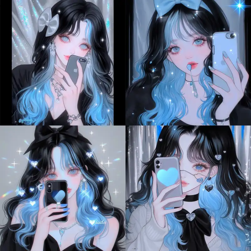 Midjourney Bot 更新时间:2024-06-07 00:06A girl with long black and blue hair, wearing a bow, taking selfies with her phone --sref