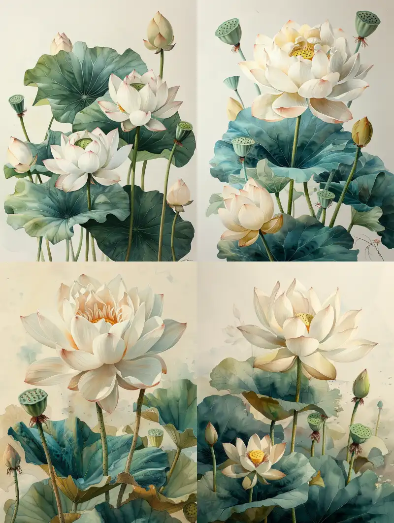 Midjourney Bot 更新时间:2024-06-03 00:06Watercolor painting, featuring a white lotus flower, green leaves, and seed pods, in Canon's style, creates a soft watercolor painting on textured paper with clear and distinct lines, rich illustration details, high resolution, white background, award-winning work, and artwork --s 758 --ar 3:4 --v 6.0
