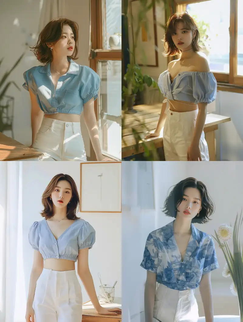 Midjourney Bot 更新时间:2024-06-03 00:07Brown slightly curled short hair, flowing hair, delicate facial features, looks like the beauty of Korean singer Jennie, wearing a blue and white contrasting short sleeved shirt, white linen high waisted straight leg wide leg pants, a two-piece set, standing against a table in a bright room, high-definition image quality, 4k ultra clear, shot from head to foot with a Canon camera, with a professional photography style and perfect details arranged to showcase full body photos --ar 3:4 --v 6.0