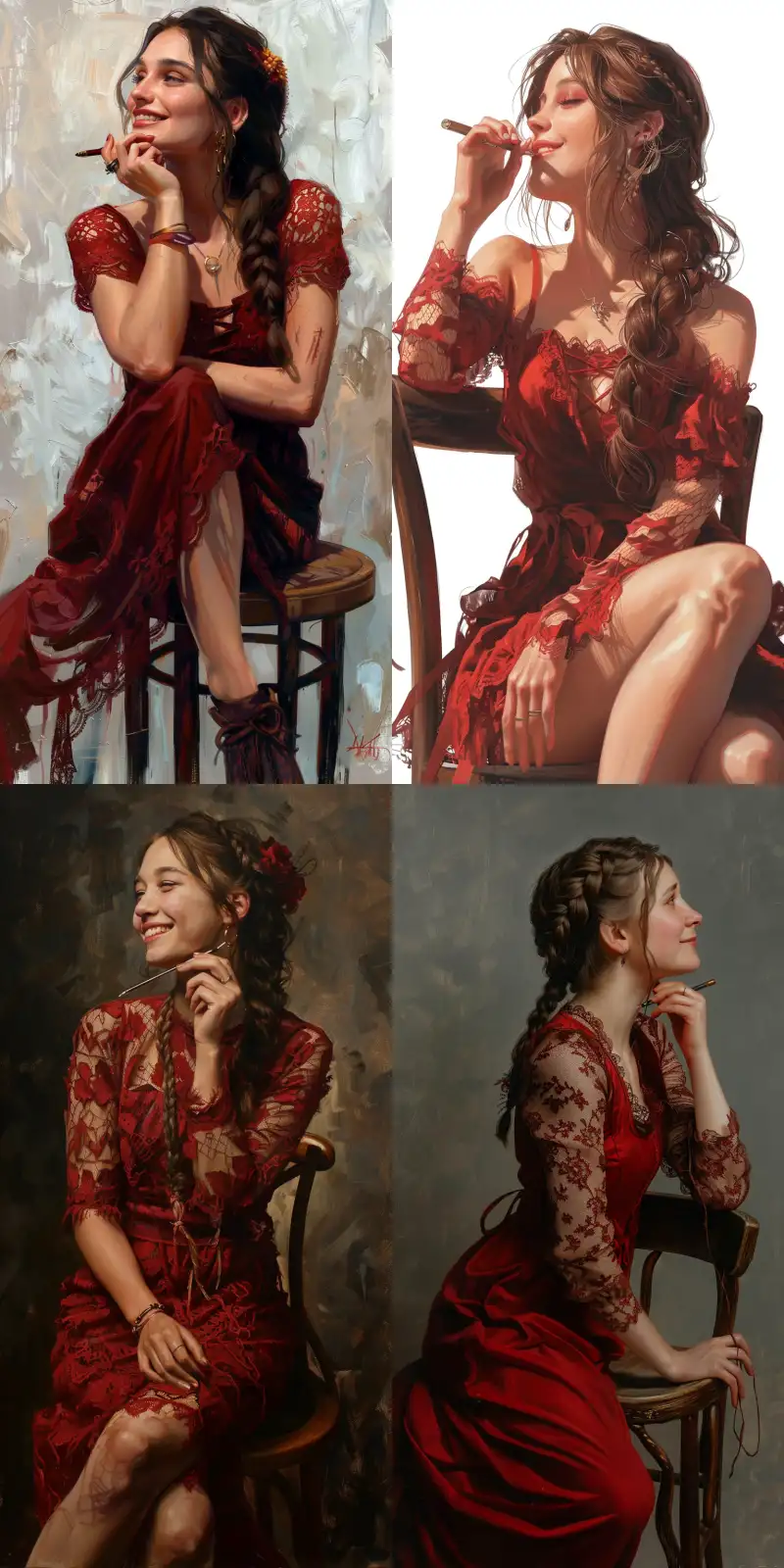Midjourney Bot 更新时间:2024-06-03 00:07The side head reveals the details of the side face and ears, with a brown hair and a braid. The 25-year-old female host sits on a high stool with a smile, wearing a red lace up dress and holding a pen in her hand to her mouth --ar 1:2 --v 6.0