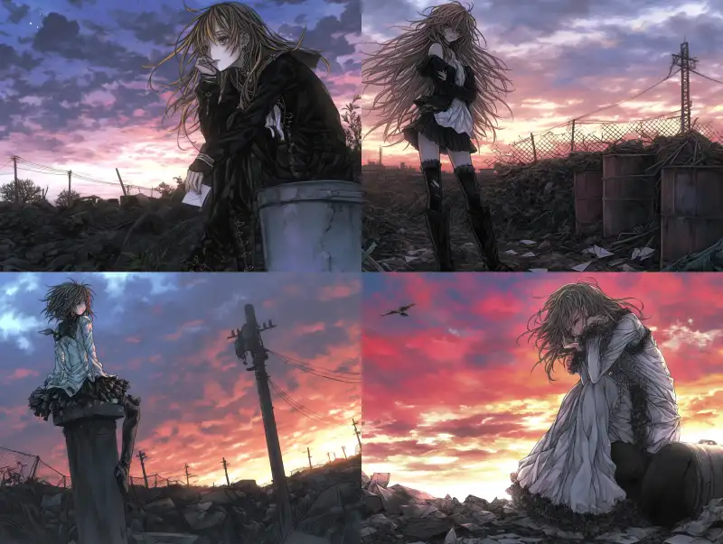 Midjourney Bot 更新时间:2024-06-03 00:07Illustration, redemption, tattered, garbage dump, the girl holding a letter tightly in her hand, dim, sunset setting, illustration, large-scale scene illustration --sref