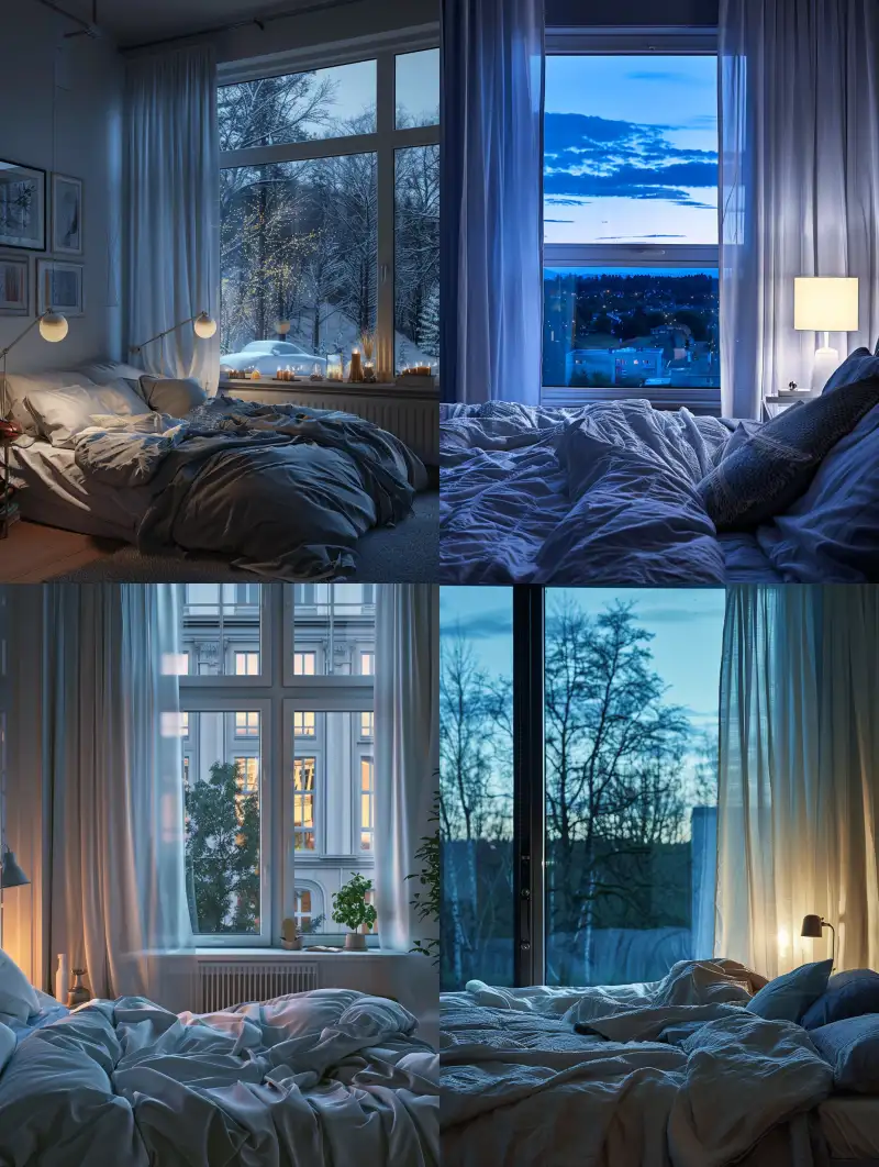 Midjourney Bot 更新时间:2024-06-04 00:01At night, a bedroom overlooking a large window is brightly lit with white flowing curtains, gray home furnishings, and bedding, --ar 3:4 --v 6.0