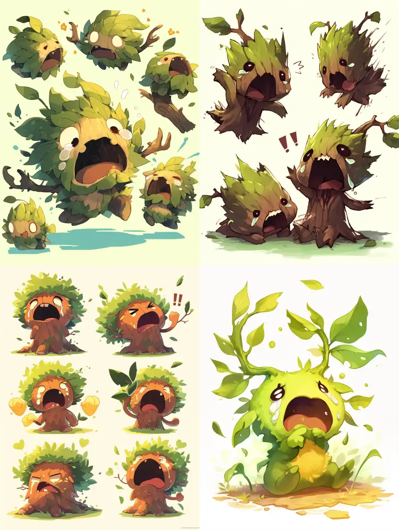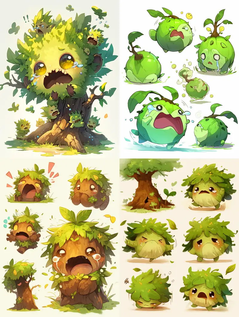 Midjourney Bot 更新时间:2024-06-02 00:04Game character design, tree spirit crying and running, Q-version, super cute, aggrieved expression, crying, big eyes, running posture, big tree transforming into small monsters, extremely cute, extremely cute, super cut --ar 3:4 --niji 6