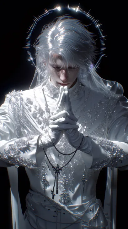 Midjourney Bot 更新时间:2026-04-01 00:23黑白分割的背景和人物,全身像,超写实,真人拍摄,非常年轻的男性,银色长发垂到腰,凌乱长发,头纱,点缀满钻石水晶和亮片的白色修士服,穿纯白手套(手套缠绕银链带十字架挂饰),悬浮光环(放射光效),合十手势,高对比光影,留白,折射光效。 顶级造型艺术,超写实细腻画质,白色美学场景,酸性金属风。大师肖像杰作,极富创意的艺术构图。 商业大片,造型概念图,朦胧梦核美学,顶级画面光效顶级渲染。 深邃神密。他的身体散发出圣洁的辉光,如同扇形线状耀阳。镭射炫彩光环,宗教隐喻。 极繁主义,极致细节,超精细,超高质感,8K分辨率,高对比度,高饱和度,动态姿势,充满张力的镜头,视觉冲击力,夺目的视觉效果,震撼画面,缠绕感,强烈张力,杰作,最佳品质, 虚幻5引擎 ,HDR写实质感 ,UE5+Octane 渲染,0.618黄金比例的身材曲线,8K分辨率,电影感,非对称式构图,细节清晰详尽,运用弥散光和轮廓光特写,高曝,过曝,暗调,伦勃朗光,强烈明暗对比,高反差,颓废,肌理质感,情绪氛围感拉满,慢快门,朦胧美学,层次感,摆出完美的形体造型,完美构图,超现实摄影效果。 厚涂,动感构图,大神级配色,大师级构图,大师级光影,Oc渲染,Cg渲染,特写镜头,对比度,高级感”wlop画风,冷白皮,细腻笔触,l,游戏cg渲染,oc渲染,BJD,半写实,细腻笔触,肌肤清透,白皙有光泽,oc渲染,强光打下,阴影层次丰富。插画,动作自然、发丝,丰富细节,高质量,最高画质细腻笔触,珠光感,白皙有光泽,刻画光影效果,虚焦,既视感,情绪氛围感拉满,层次丰富,写意,朦胧美学,光的美学,超现实,高级感,杰作。原比例。比例 9:16 --ar 9:16 --stylize 100 --niji 7