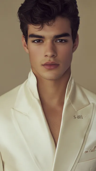 Midjourney Bot 更新时间:2026-04-02 00:01拉美裔男性,24岁,面容精致完美到近乎非人。面部轮廓流畅柔和,颧骨高度适中,面颊饱满,下颌线条圆润,下巴小巧。眉骨平顺,眉形细长舒展,眉峰柔和,没有任何攻击性。眼窝深度适中,眼型为圆润的杏眼,虹膜为深棕色,眼神空洞而温顺,如同精心编写的AI程序,缺乏真实的情感波动。鼻梁高挺,鼻头圆润精致。嘴唇饱满,唇形清晰,唇角永远微微上扬,带着训练有素的讨好微笑。深棕色短发,发丝柔软顺滑,三七分,刘海轻扫额头,发型精致整洁,每一根发丝都被精心打理。 服装:白色高领修身套装,材质为带有珍珠光泽的绸缎,如瓷器般光洁无瑕。上衣为高领长袖,领口紧贴颈部,领口处有一圈极细的银色金属边。胸前左侧绣有金色的系统徽章,徽章下方有一行极小的编号“S-001”。腰部束以细窄的白色皮革腰带,扣头为金色,小巧精致。下身搭配同色系直筒长裤,裤线笔直,裤脚刚好触及脚面。脚穿白色浅口皮鞋,鞋面光洁无尘。整体造型如同一件被精心包装的奢侈品。 配饰:脖子上戴着一条细窄的金色金属颈环,颈环表面光洁无纹,象征他顶级定制资产的身份。颈环正面嵌有一枚极小的蓝色宝石,代表“待命”状态。手腕上无任何配饰,皮肤光洁无瑕 --ar 9:16 --v 6.1 --stylize 100