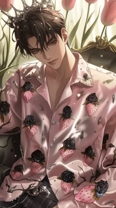 Midjourney Bot 更新时间:2026-04-02 00:01动漫插画,一个动漫俊美男人,粉色草莓图案真丝衬衫oversize,黑玫瑰+荆棘+碎钻+钻石+雕刻+金属银拉丝+卷草纹+绸缎crown,郁金香氛围,坐在扶手椅上 --ar 9:16 --style raw --stylize 100 --niji 6 --no no