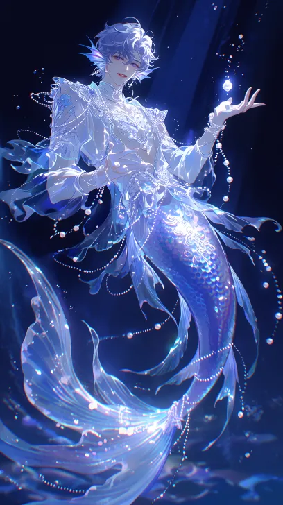 Midjourney Bot 更新时间:2026-02-13 00:04东方美少年,种族:美人鱼:皮肤自皙,微熏。眼睛狭长(漂亮的瞳仁,微眯,浓密清晰的睫毛,芭比感的睫毛)白皮肤,细腻的白皮肤。眼波含媚、唇水润抿着,活泼开朗,活泼开朗,活泼开朗,活泼开朗感、眉眼活泼开郎。紫色紫色紫色渐变紫色长发(无刘海后梳,前短后长,微卷发尾,光泽感,根根分明,贝壳珍珠装饰少年的躯干上缠绕珠光纱贝壳,面部人鱼的全身图,竖立游动状态,巨大华丽的梦幻的冰蓝色人鱼尾巴展现出阴暗病态的气质同时脸上带着羞涩神情。画面逆光效果,镜头模糊且极具颗粒、磨砂质感。手心向上摊开,一只手朝镜头方向伸出, 从动态视角的仰视角度拍摄,背景是深海深渊之下神秘的墨蓝色梦核场,手上有个悬浮珍珠,莹润的珍珠还在发亮皮肤莹润珠光感皮肤,通透肤感,中式华丽繁复美学风格2.5D伪厚涂,半写实风格,材质纹理渲染+胶片颗粒细节 --ar 9:16 --c 14 --stylize 1000 --niji 7 --no Profile,侧脸,脸部特写,3D画风,现实画风,扭曲脸部,奇怪比例,非p值画风,人物畏手畏脚,人物模糊,害羞,可爱,萌妹子,萌,幼态脸,眼睛发光,仰头,大红厚嘴唇,水滴,丝带,绷带