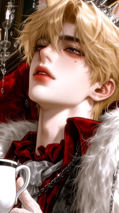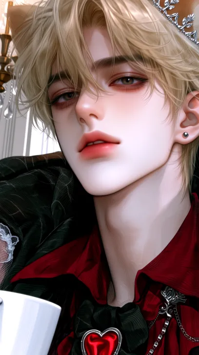 Midjourney Bot 更新时间:2026-02-13 00:05男生,中角度镜头,相机仰视着一个金黄色头发微卷狼尾鲻鱼头,发丝凌乱的青少年,发丝飘逸,刘海自然垂落,桃花眼,眼尾痣,眼眶狭长,睫毛清晰分明,挺直的鼻梁,头上戴着银饰简约皇冠,浅红色薄唇,冷峻锐利的眼神,清晰的下颌线。穿着一件深红色丝绸质感的泡泡袖衬衫(雪纺荷叶边),面料上有着银饰链条做配饰,脖颈处有着红色蝴蝶结脖环,手上端着法式茶杯,白蕾丝网纱手套,背景:宫廷卧室背景,水晶吊灯,半厚画技术,详细的纹理,切片生活感,韩式厚画,3d艺术风格合,强烈的模糊背景,2.5d风格,详细的背景,厚画,超现实,真实的纹理,柔和的室内照明 --ar 9:16 --stylize 490 --niji 7 --profile xe5id5h