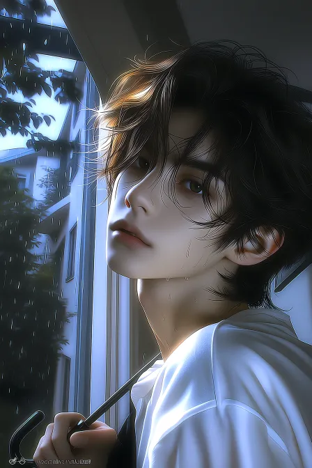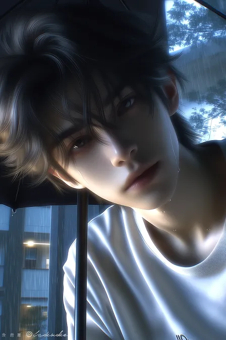 Midjourney Bot 更新时间:2026-02-13 00:07https://images.gogpt.vip/aigf/m_origin/20260213/2055097/j3wxmrdls4t8du8o.jpg 半写实厚涂风格,2.5D游戏美术质感,明显的笔触细节,强烈的材质对比,低饱和度冷调色,轻微过曝。青年男性,苍白皮肤,脸颊上有雨水滑落,凌乱的有些湿的中长黑发,浓眉,下垂的深棕色大眼睛,雾蒙蒙的目光,忧郁俊俏的脸庞带着脆弱的表情。 服装:白色的衬衫,松垮的露出锁骨。姿势与构图:仰头看向观者,在大雨中站着,人在右边,从上方俯视拍摄,四分之三侧面,上半身和面部焦点。手在身前打着一把黑色的伞,脆弱姿态。背景与光照:马上天黑,背景是在雨里只有朦胧的看见现代房屋和几颗树。头发和肩膀有一小点轮廓光。忧郁的氛围,浅景深。 --ar 2:3 --stylize 400 --iw 0.25 --niji 7 --sref https://images.gogpt.vip/aigf/origin/20260212/1770909345941057_1.png https://images.gogpt.vip/aigf/m_origin/20260212/2055097/0ipbsbavinwmczsc.png --sw 382