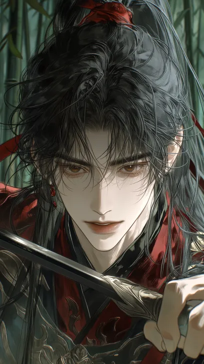Midjourney Bot 更新时间:2026-02-13 00:12中国水墨画风,男性,黑色长发扎成高马尾,红色的发带绑着头发,发丝分明,长长的飘扬。五官精致端正,好看,浓密的睫毛,狭长的眼睛,粉色的嘴唇,微微俯身,手中握着剑柄,剑身横在身前。他穿着红色的中国古代的衣服,绣着暗纹,画面聚焦在他的脸上,人物占据画面的全部,他的眼睛是棕色的。游戏cg,高质量,细腻笔触,二次元写实风格,虚无缥缈,狠厉,背景为古代竹林内,翠绿的竹子。 立体性,淡淡的朦胧氛围。8k画质,高级打光,细节刻画。 --ar 9:16 --stylize 800 --niji 7 --no 仰头